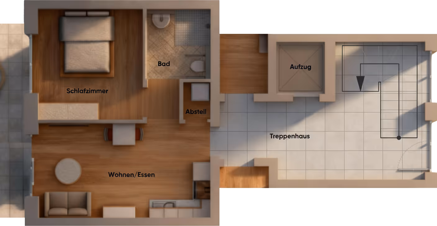 Der Wohnbereich strahlt mit seinen hellen Farben und der behaglichen Fußbodenheizung pure Gemütlichkeit aus.