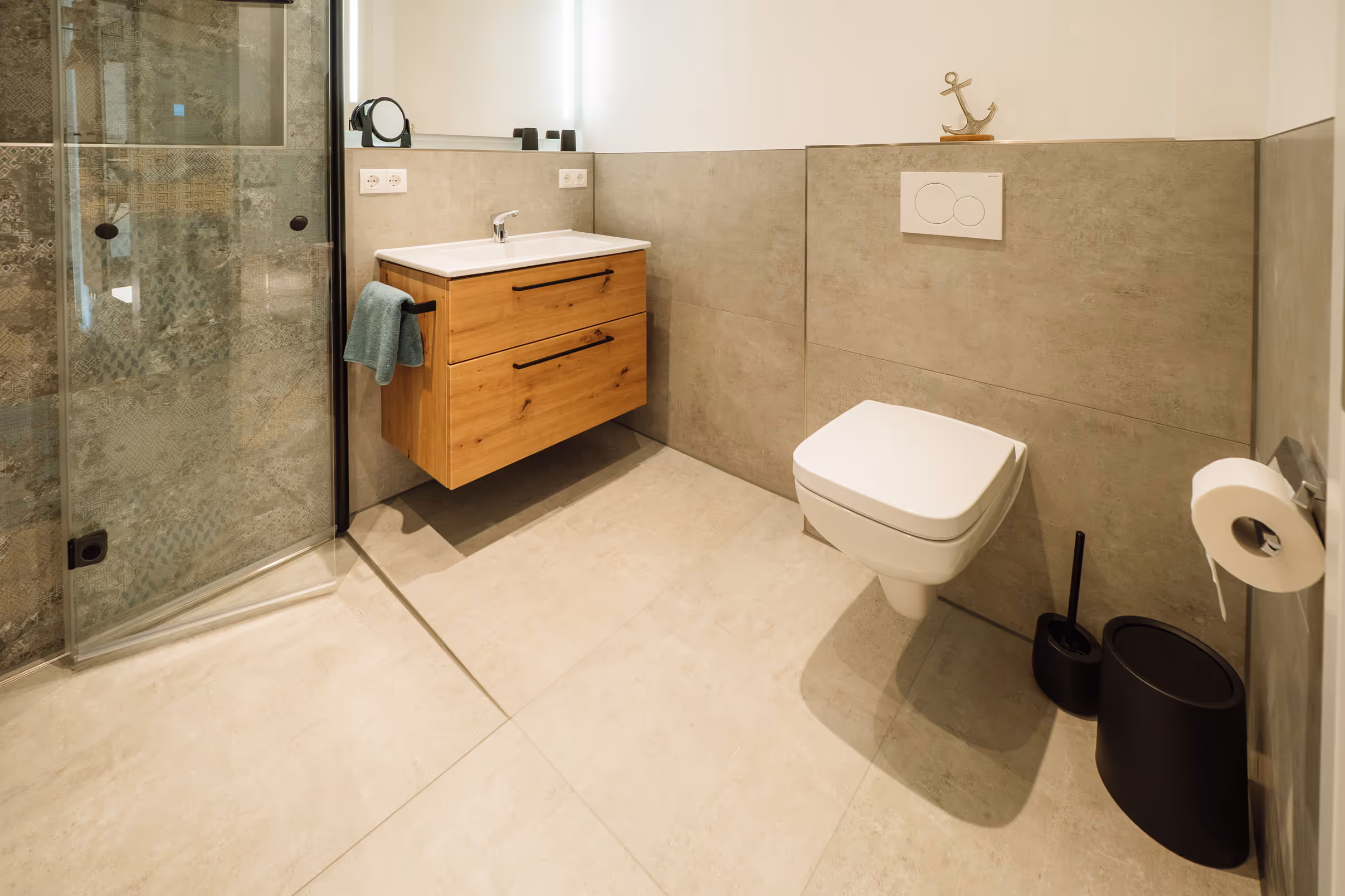 Das moderne Bad mit bodengleicher Dusche lässt den Tag stilvoll beginnen.