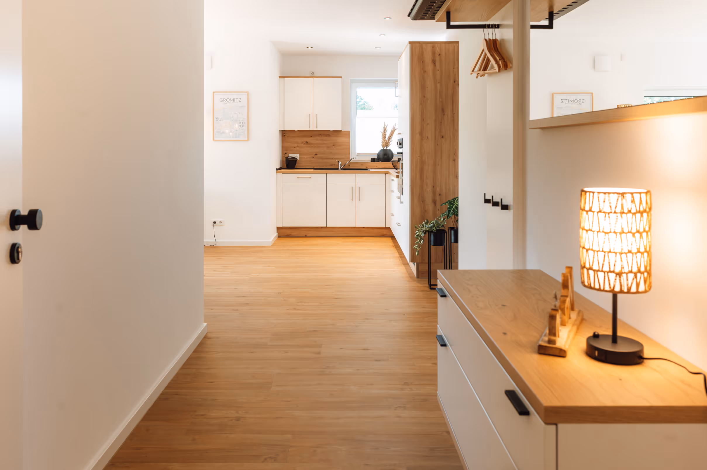 Die moderne Einrichtung, harmonische Farbwelt und das dezente Lichtkonzept schaffen eine Atmosphäre, in der du dich sofort zu Hause fühlst.