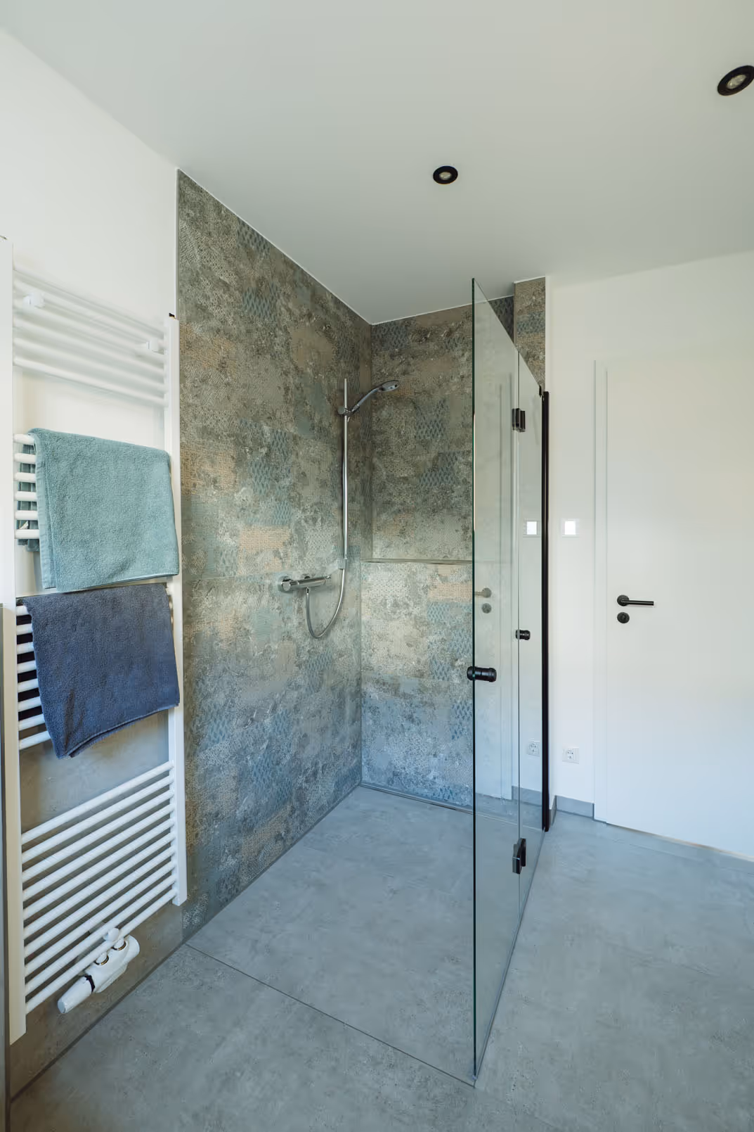 Im Badezimmer triffst du auf modernes Wohlfühl-Ambiente mit bodengleicher Dusche und feinen Details.